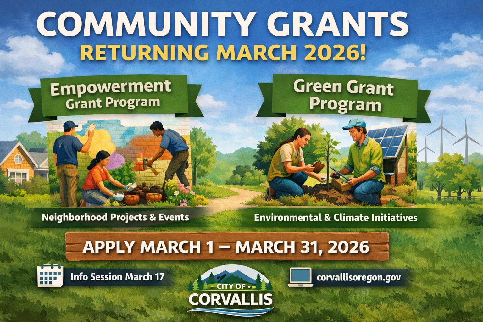 Corvallis, OR — Two local funding programs are reopening to support grassroots projects and community priorities in Corvallis this spring. Applications for both the Empowerment Grant Program and the Green Grant Program open March 1 and will be accepted through March 31, 2026.