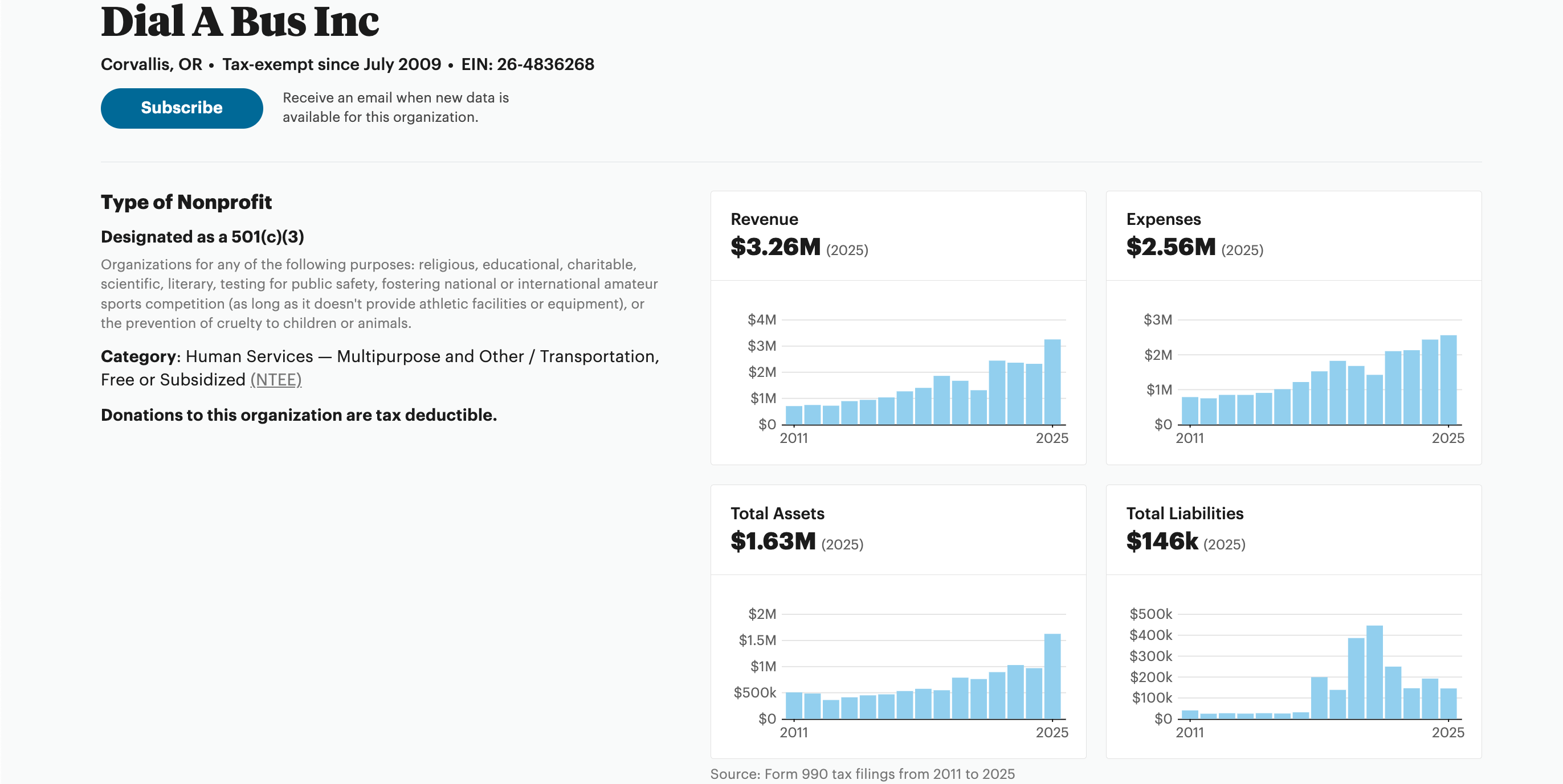 Dial-A-Bus revenue has increased from $1.6 million in 2021 to $3.26 million in 2025.