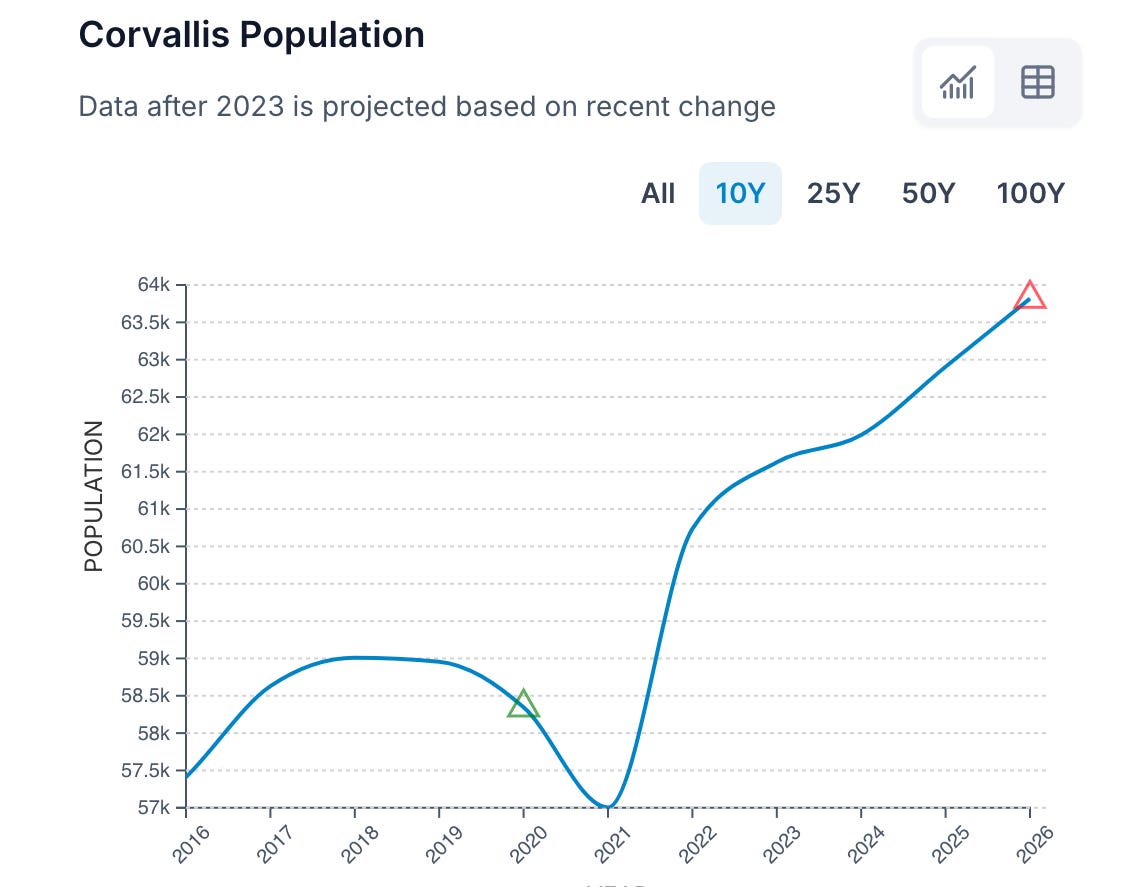 Unlike some metropolitan areas that saw sharp swings in growth during and after the pandemic, Corvallis has experienced steady, moderate increases with no major population declines reported in the latest datasets.
