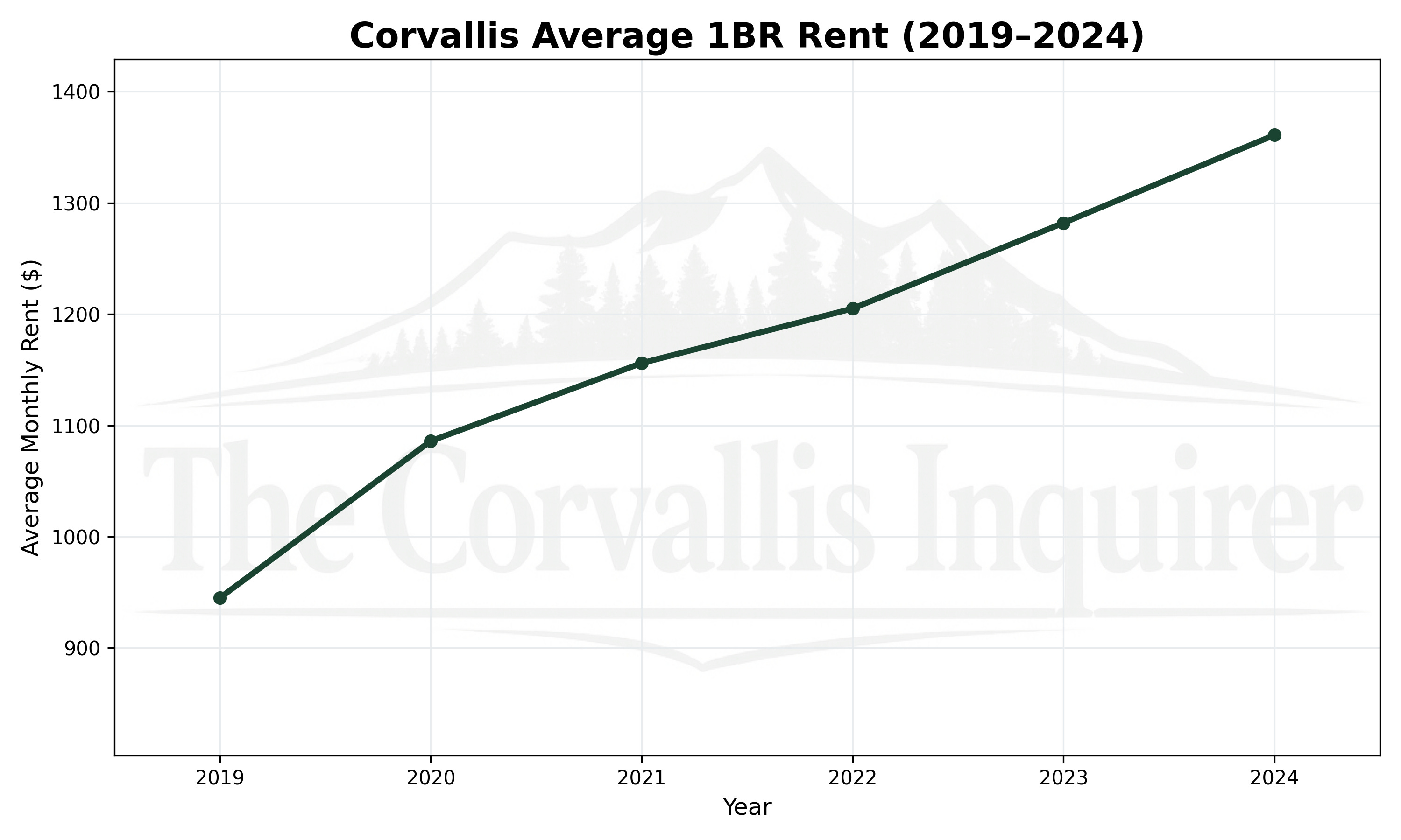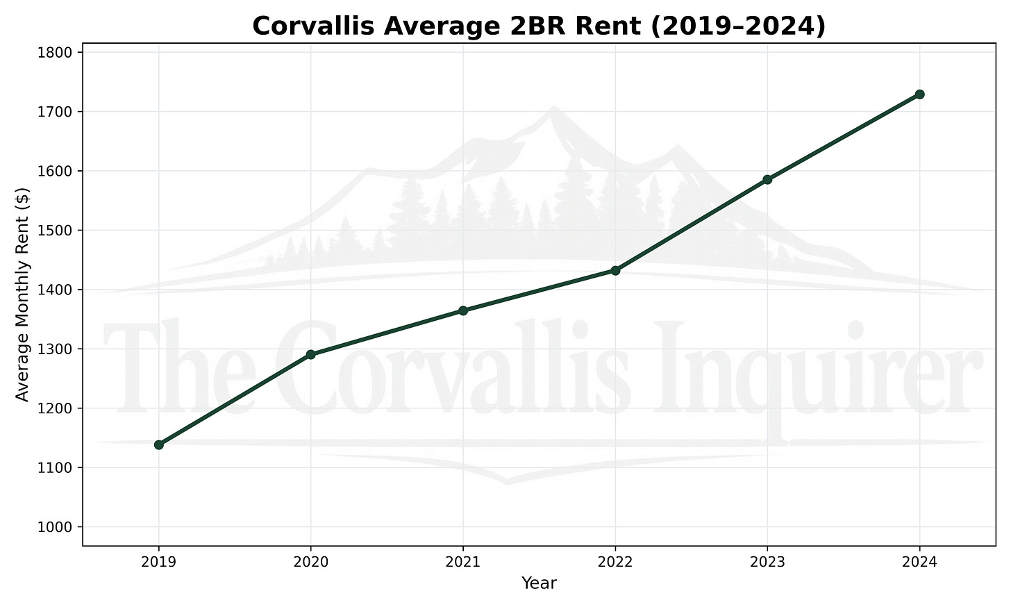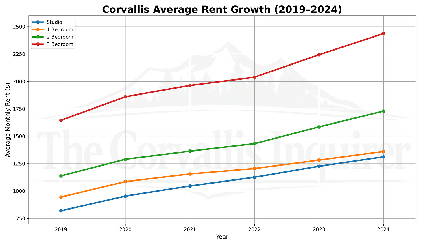 Rents in Corvallis have risen sharply over the past five years, with average monthly prices climbing between 44% and 60% depending on unit size.