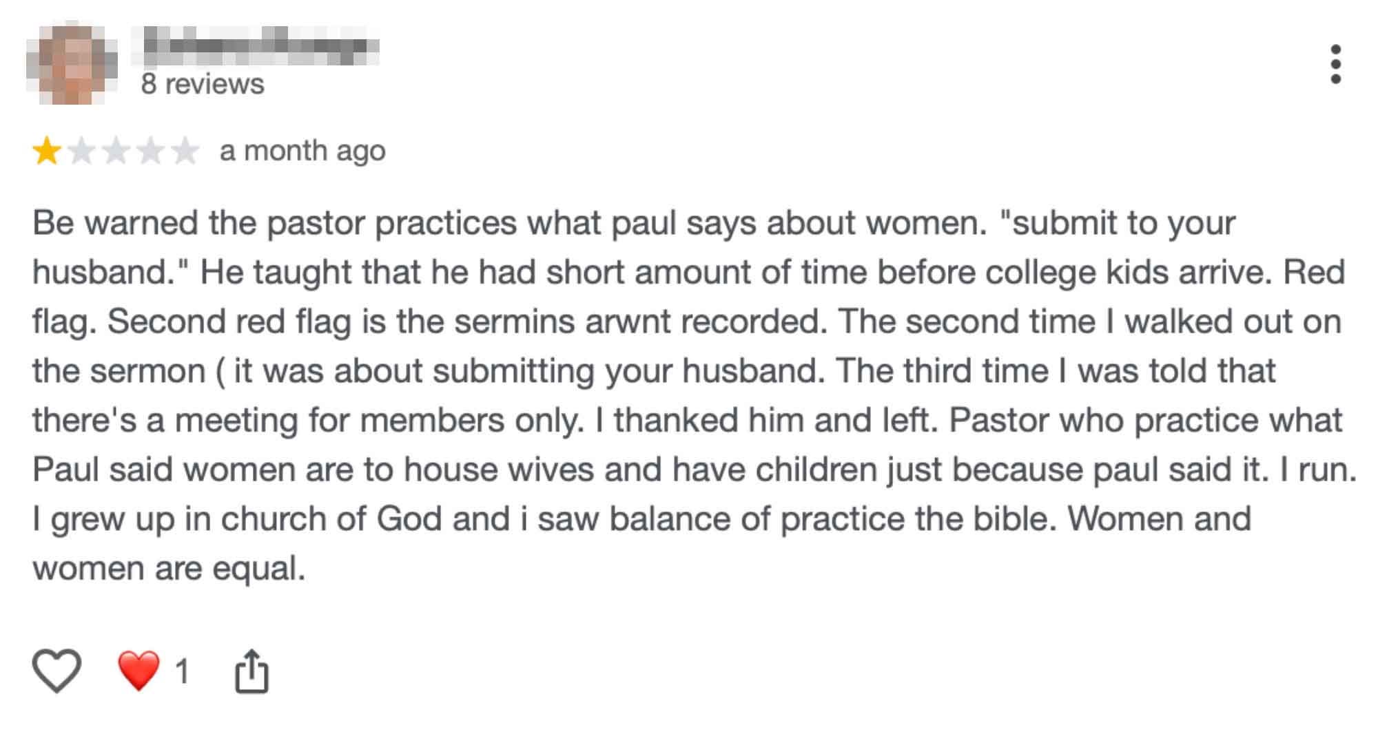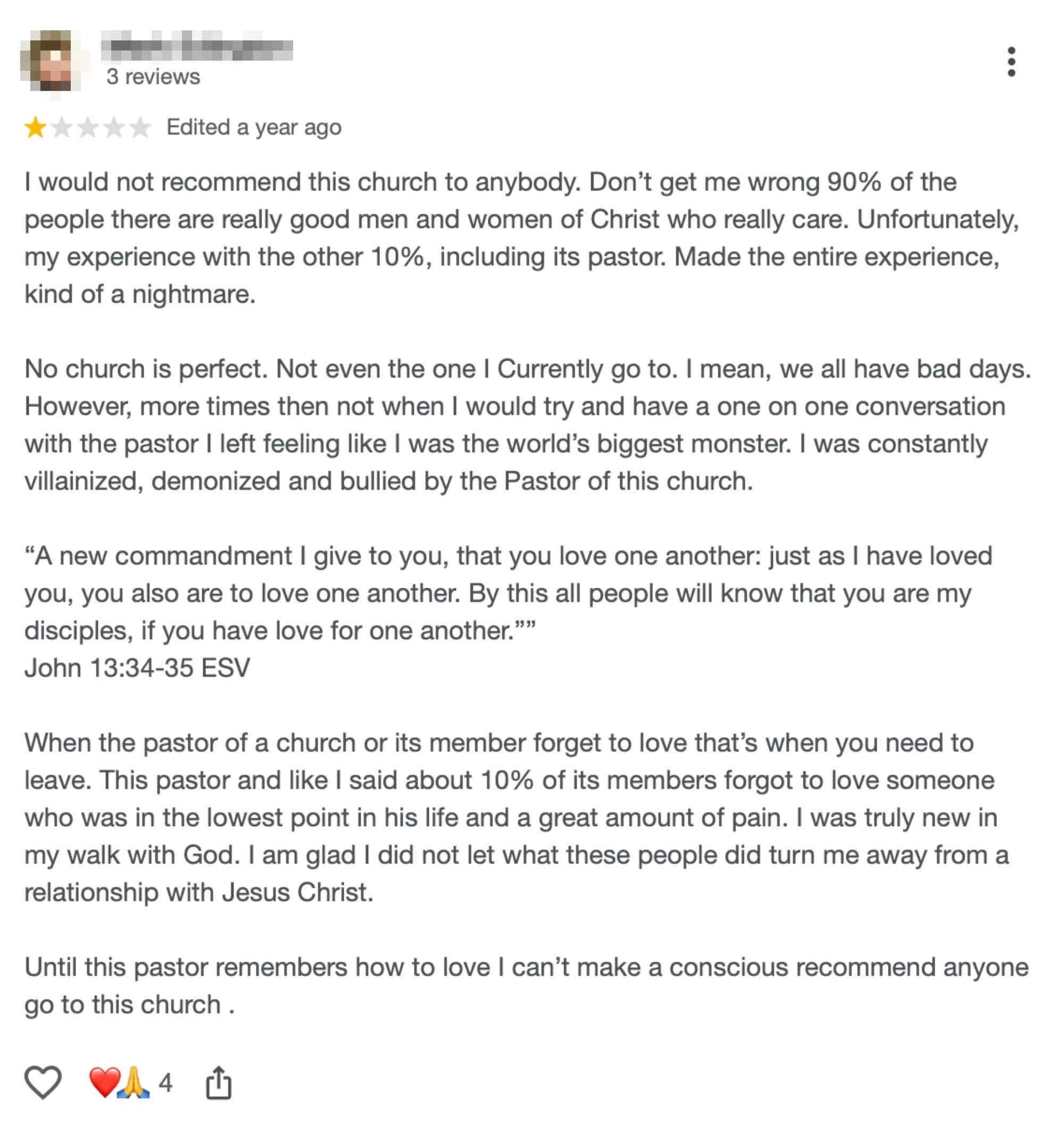 “I was demonized and villainize, By this church pastor. I went to this church for almost a year. Although it’s been well over a year since I’ve step foot in this church, the spiritual wounds that this man and this church has done to me is still fresh.”