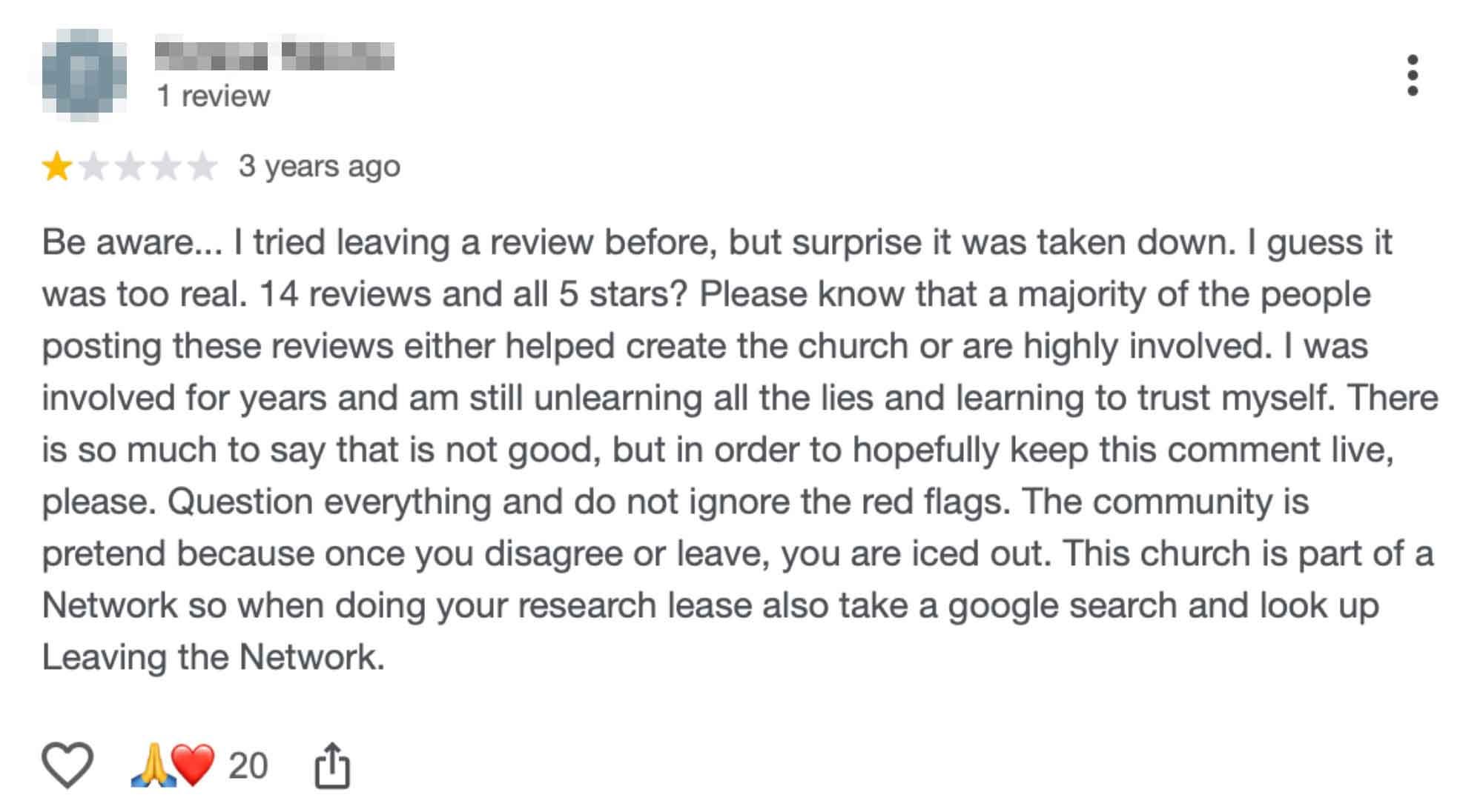 “Families of students and all in your community this is a high control group and is very dangerous. My daughter started attending a Network church in the mid-west while in college. She has now cut herself off from her entire family.”