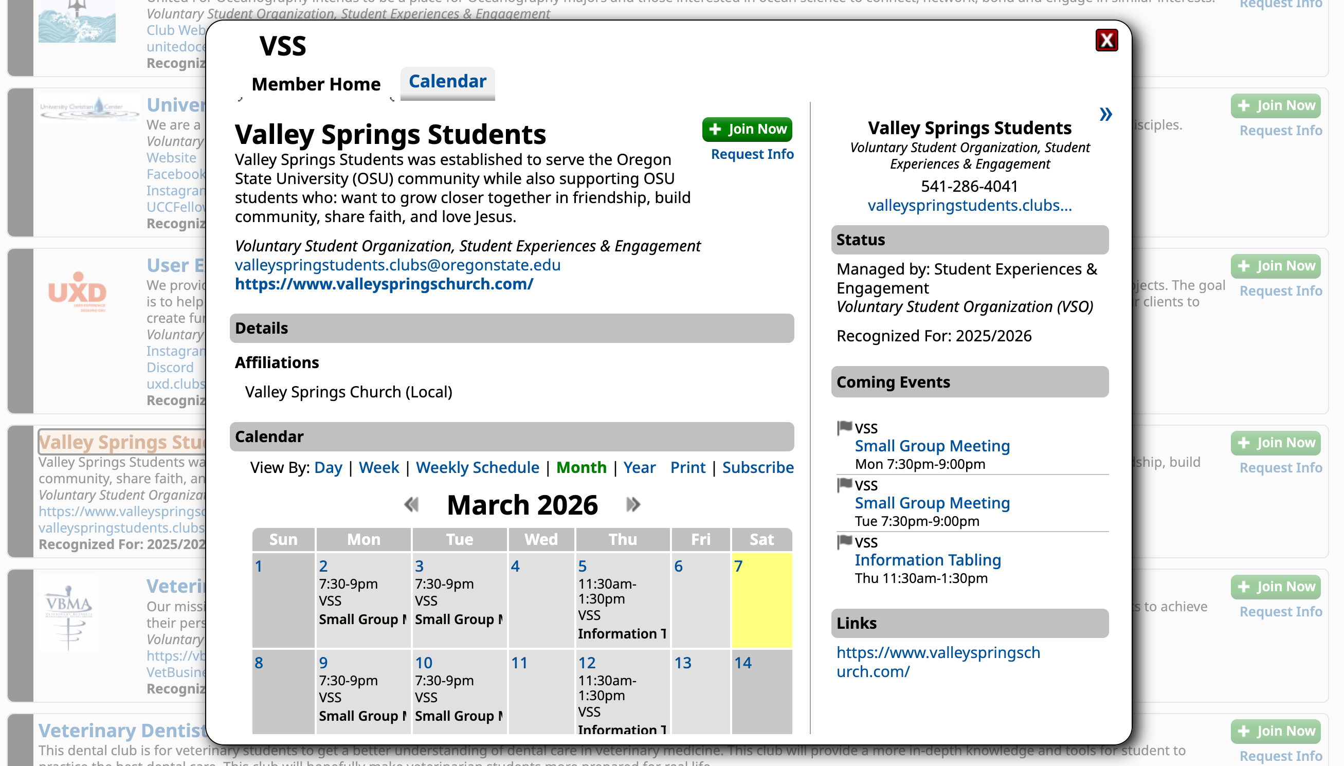 Oregon State University’s club directory, which lists student organizations and affiliated groups, have “Valley Spring Students” listed. See the listing here (view page 17). Valley Springs Church is referenced through campus groups connected with its network, according to listings on OSU’s student engagement portal.