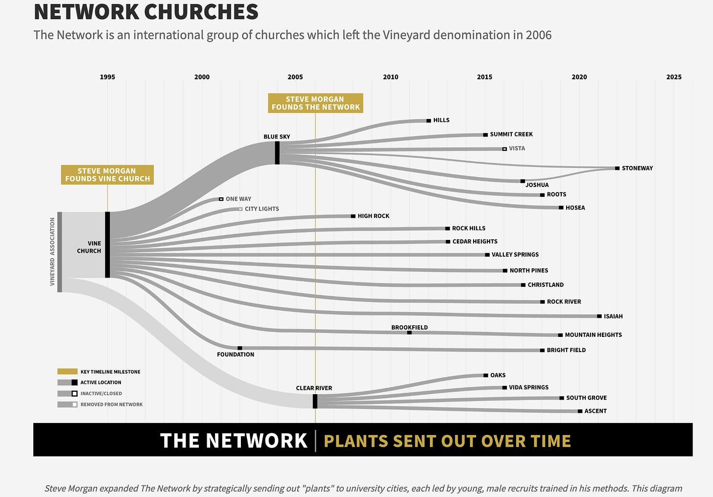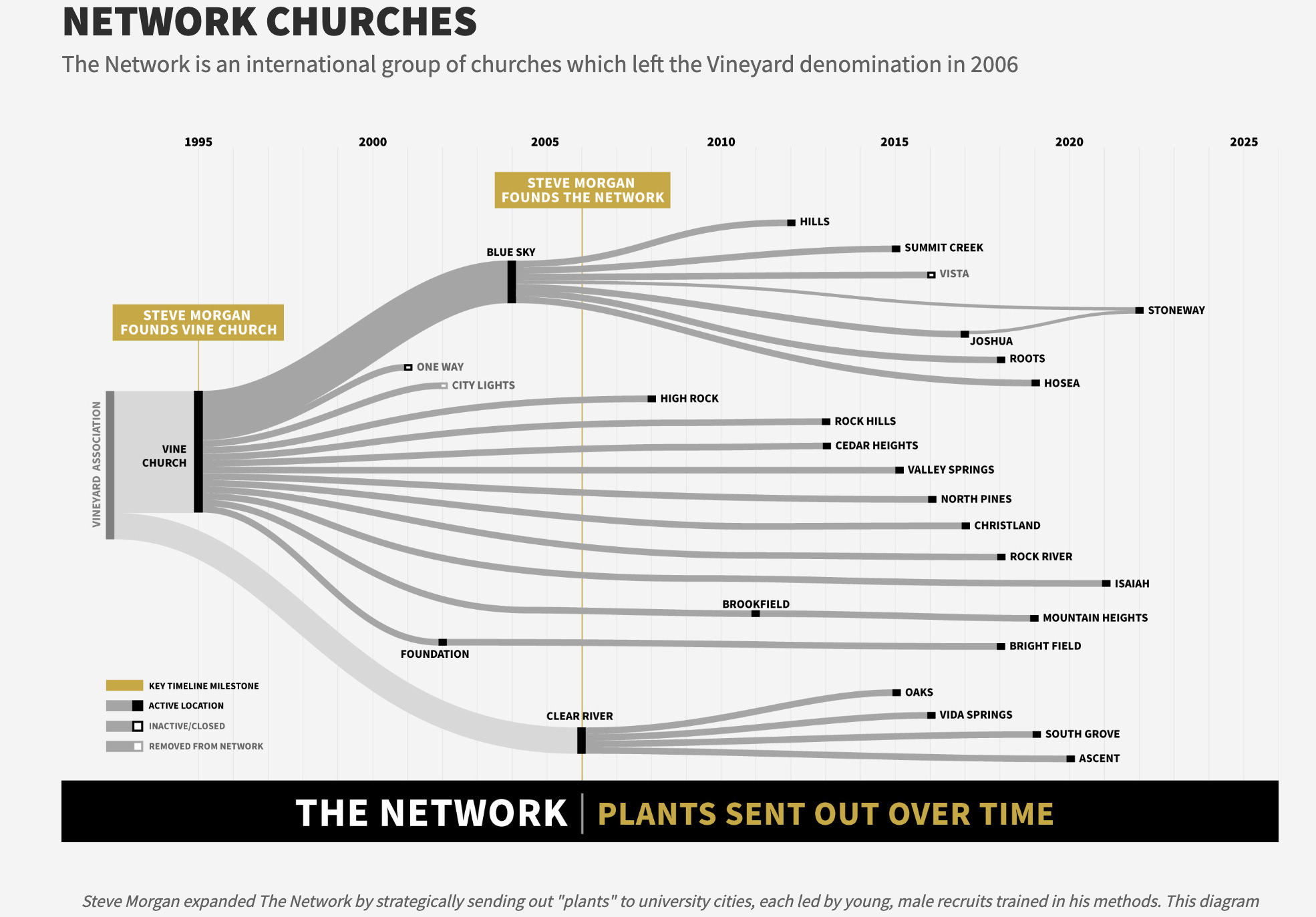 “The Network” group of affiliated churches founded by pastor Steve Morgan. Morgan originally planted a church in Carbondale, Illinois, in 1995, which later became known as Vine Church. In 2006, Morgan and several churches separated from the Vineyard Association of Churches to form an independent church-planting network that would eventually expand across multiple states.