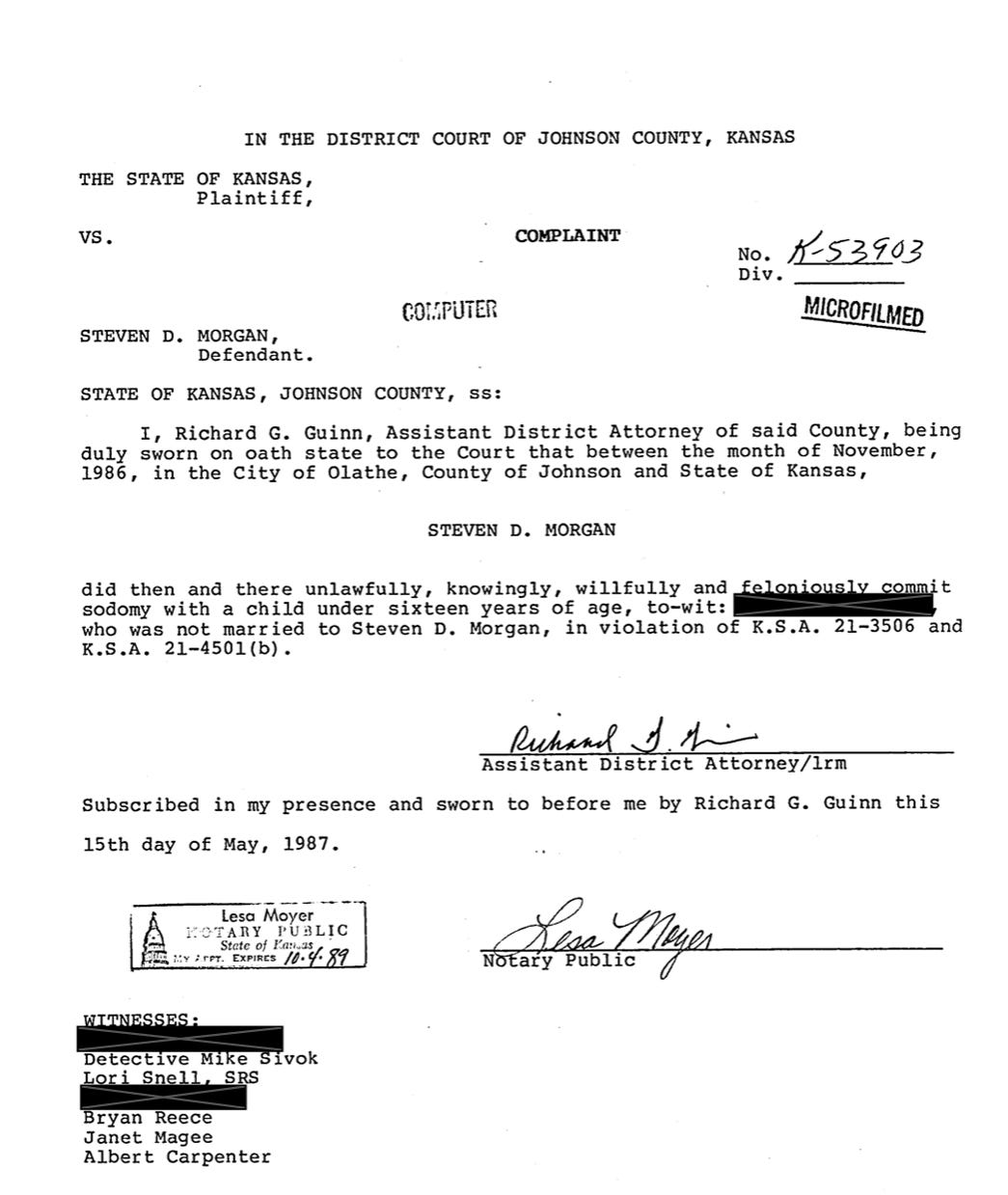 According to the report, the case was filed in Johnson County, Kansas, under case number K0053903, with charges listed as KSA 21-3506 (Aggravated Criminal Sodomy against a minor) and KSA 21-4501b (Class B Felony).