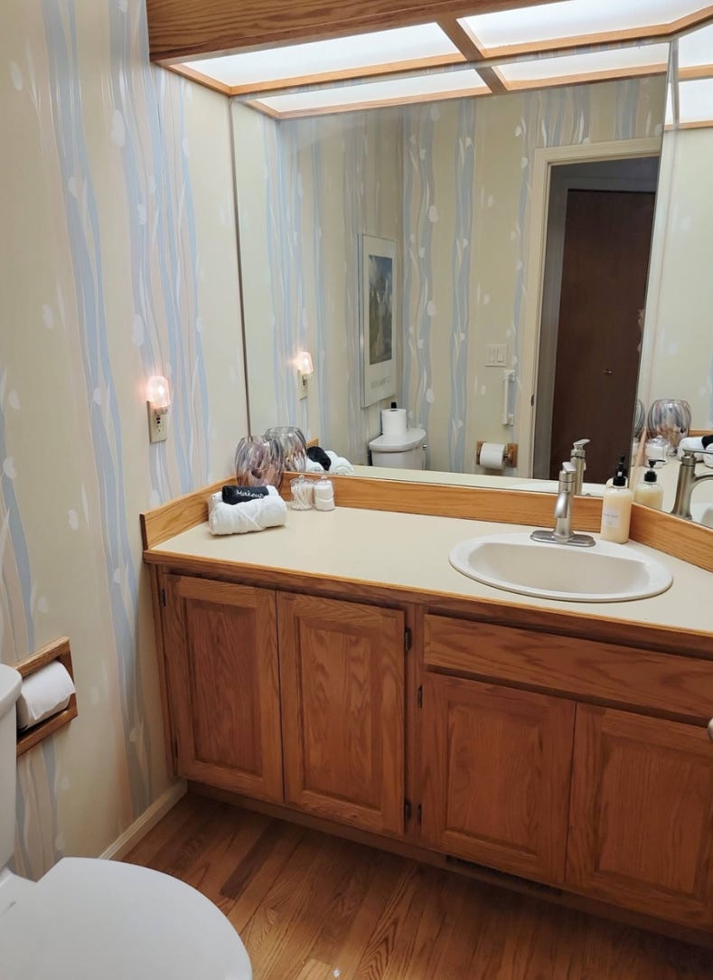 We’ll do an investigative report on the bathroom wallpaper. Or wait, is that just unfinished walls, with seams and patchwork? Or is that the wallpaper? We are on it.