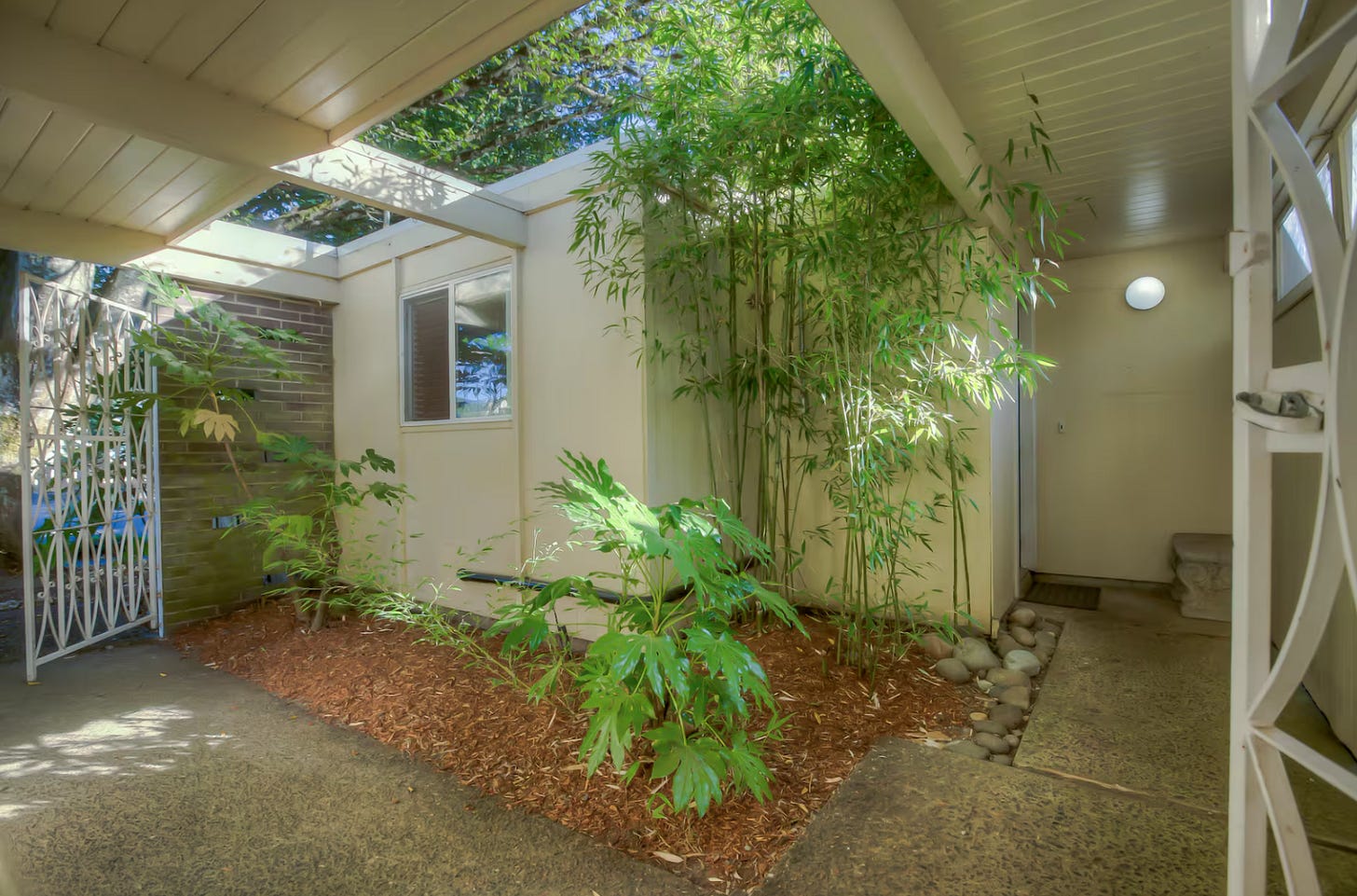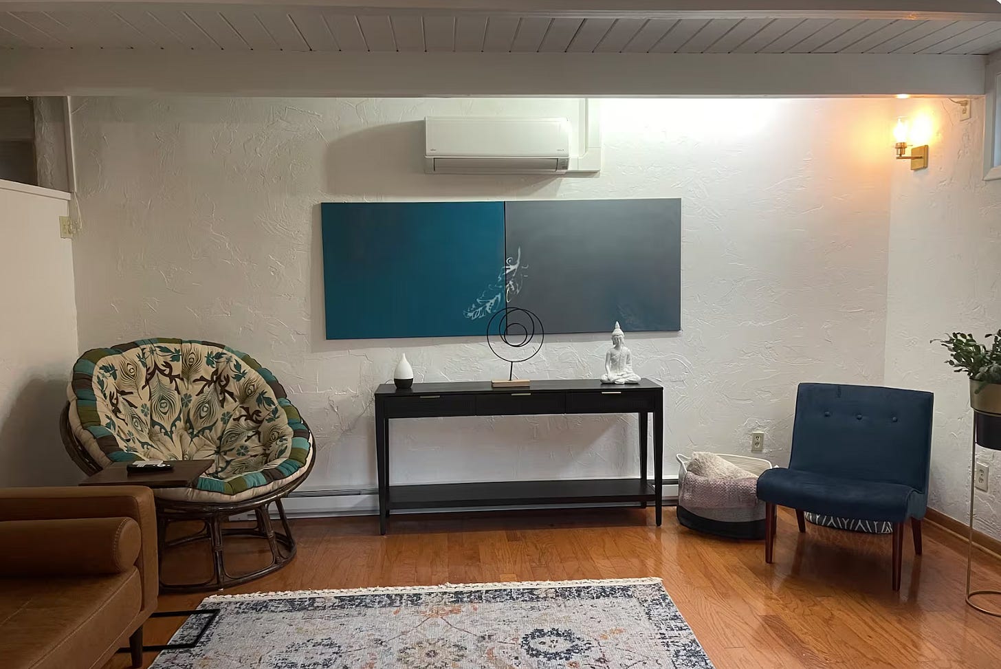 This place has a little bit of everything. A gorgeous sliding door to an outdoor setting in the bedroom, free pretzels, and a two-color, evenly divided abstract art piece that, if you stared at it too long, might start judging you. Cozy, great lighting, and a fun courtyard.